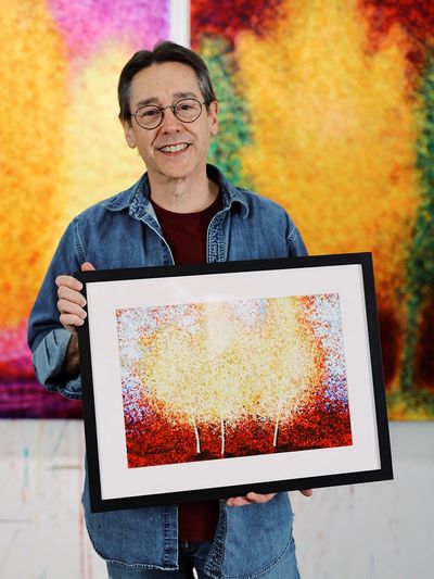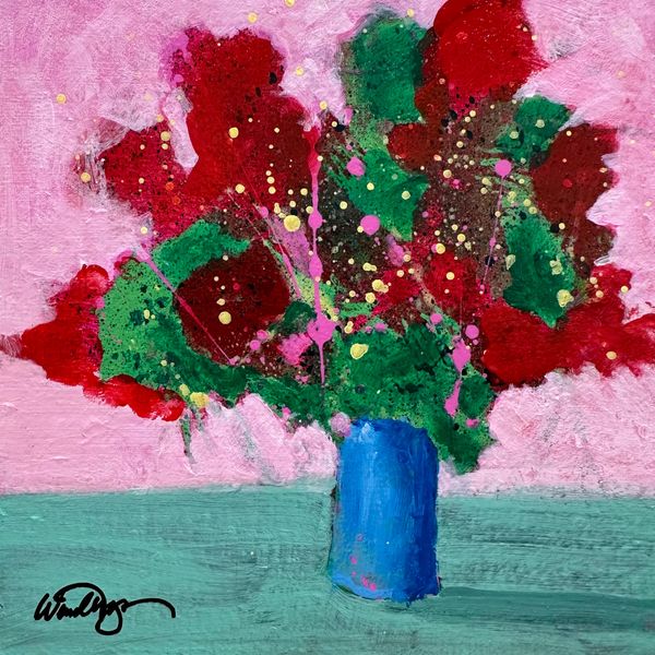 Flowers in Purple Pot, is a radiant composition that channels a joyful vitality through its interplay of bold color and kinetic brushwork. Bursting from a rounded lavender vessel, clusters of crimson, lemon-yellow, and blush-pink blossoms pulse with energy against a vivid tangerine background. Myers employs dynamic splashes, drips, and layered pigment to blur the boundaries between representation and abstraction, conjuring a sense of spontaneous movement. Eschewing traditional still life conventions, the work leans into visual exuberance and chromatic intensity, offering an immersive, sensory experience grounded in color, rhythm, and expressive immediacy.