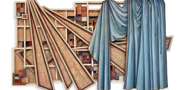 This work by Chuck Fischer embodies a dynamic fusion of dimensionality and narrative, utilizing fabric-like folds and angular structural elements to create a layered, sculptural painting. The piece is dominated by a richly draped crimson "curtain," evoking the fluidity and drama of textiles while rendered with precise, painterly technique. Below, fragmented wooden frames extend outward in a deconstructed rhythm, exposing inner compositions of smaller, framed elements.