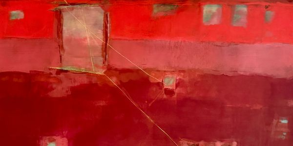Yacovelli immerses the viewer in a field of crimson and scarlet, punctuated by glowing windows and a central doorway-like form. Layers of encaustic wax create both solidity and translucence, where passages seem to open and dissolve within the surface. The work evokes ideas of entry and crossing, suggesting liminal spaces that bridge the seen and unseen—a meditation on movement, transition, and the power of thresholds.