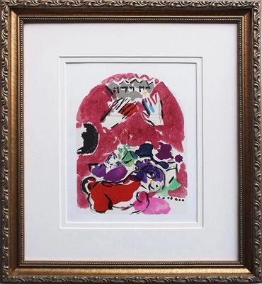Marc Chagall (Russian/French, 1887-1985) born Moishe Zakharovitch Chagalov, studied in St Petersburg. From 1910 to 1913, he lived in Paris where he became friends with Amedeo Clemente Modigliani. Often considered one of the founders of Fauvism and Cubism, Chagall's work emphasized painterly qualities and strong colors over the realist presentation of Impressionism. He once said, "All colors are the friends of their neighbors and the lovers of their opposites." After a trip to Israel, Chagall described the Bible as “the greatest source of poetry of all time” and from then on he said he “sought this reflection in life and in art”. A museum is dedicated to him in Nice and another in Vitebsk in Belarus. Charged with numerous public commissions such as stained glass windows, ceiling decorations and wall decorations, Chagall is a major representative of modern art in France in the 20th century. Some of his works are available in our Art Gallery and we offer them here today.
