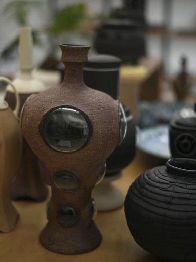 Mark Lester's artistic practice is rooted in an exploration of form, texture, and material interplay. Primarily working with ceramics, he employs techniques such as wheel-throwing and slab construction to create intricate, multi-dimensional works. His process frequently integrates additional materials, including glass, metal, and wood, which are incorporated during or after firing to enhance the tactile and visual complexity of each piece.