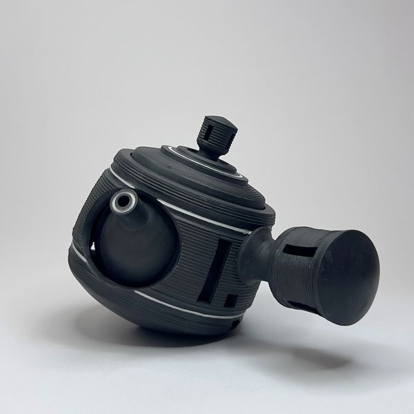 This teapot, crafted in black porcelain, explores duality through its double-walled construction. The spherical body is segmented with precise incisions, exposing an inner chamber and creating a layered interplay between interior and exterior. A spout and handle, integrated into the design, maintain functional integrity while enhancing its sculptural form. Subtle grooves encircle the body, adding texture and visual rhythm to its minimalist aesthetic. The lid, with a central knob, completes the composition, emphasizing the balance between utility and abstraction. This work bridges the boundaries of traditional craft and contemporary design, showcasing precision and innovation.