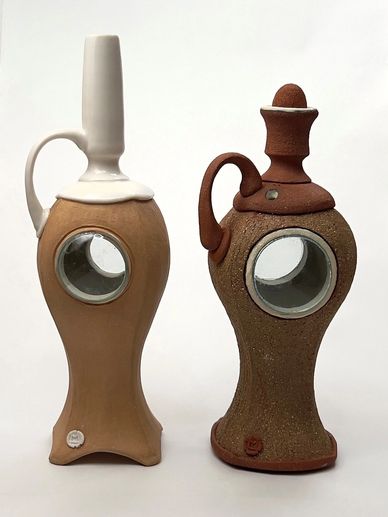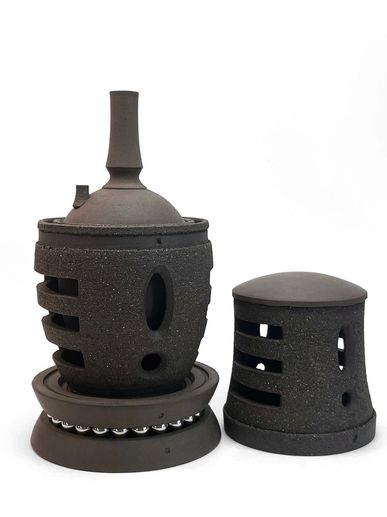 This vessel integrates clay and wood in a refined exploration of form and function. The spherical body, crafted in brown clay, is marked by linear incisions that define its shape and movement. A circular window punctuates the surface, allowing a view into its interior and inviting interaction. A cedar wood handle contrasts with the ceramic body, adding a tactile and visual counterpoint. The vessel rests on a pedestal base, providing stability and presence. A cylindrical companion piece complements the design with vertical accents. This work balances utility and artistry, merging material and form with thoughtful precision.